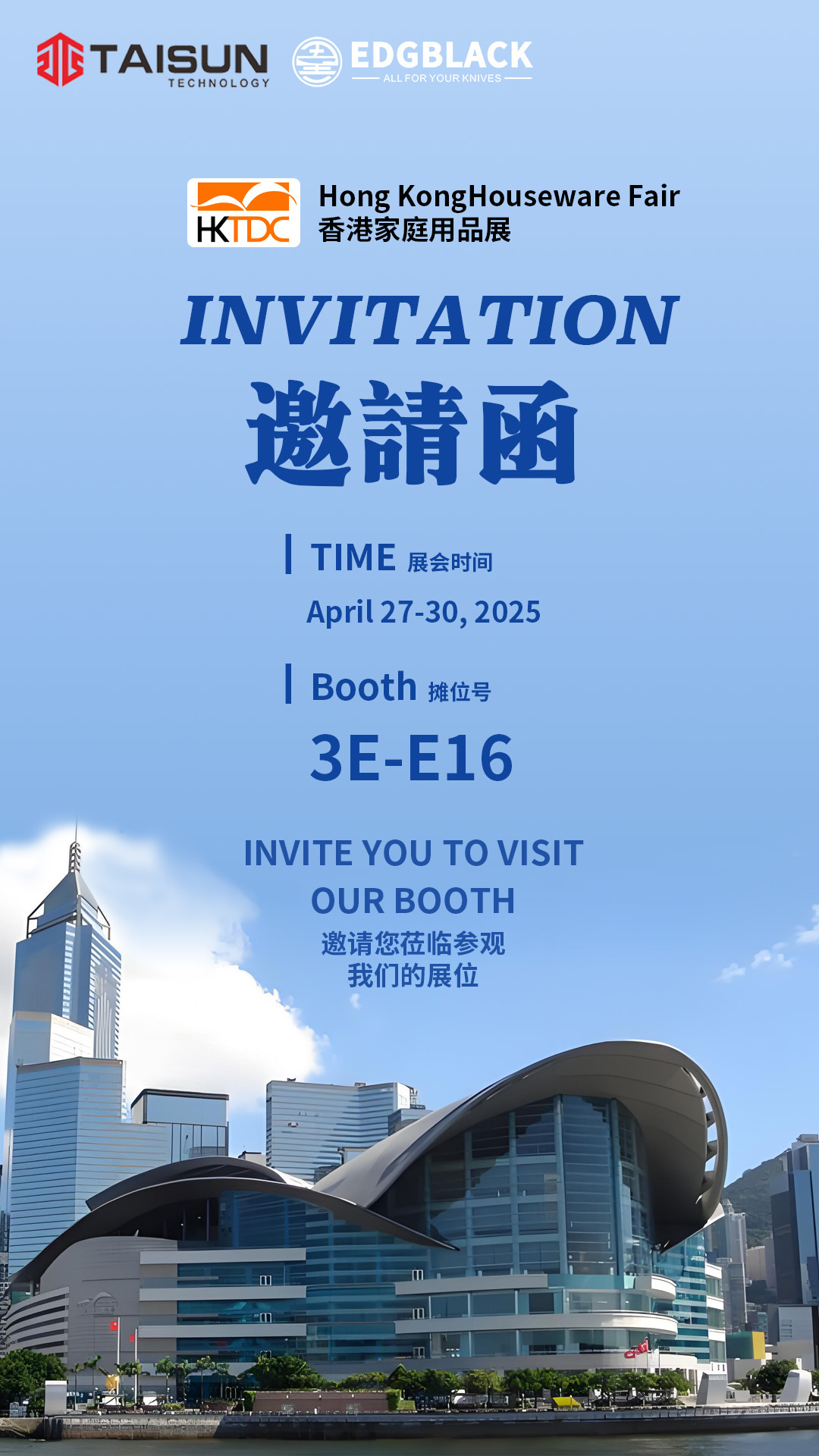 TAISUN sincerely invites you to visit our booth at the Hong Kong Houseware Fair, organized by the Hong Kong Trade Development Council, from April 27–30, 2025. We will be showcasing our latest EDGBLACK technology, designed to provide the perfect sharpening solution for all kinds of knives, combining innovation, precision, and durability.